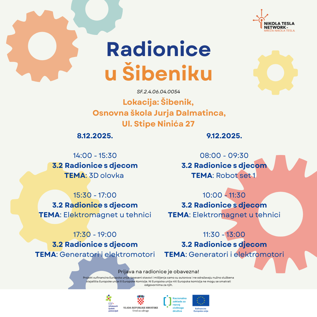 Dok vani vlada adventska i vesela atmosfera, u Osnovnoj školi Jurja Dalmatinca u Šibeniku uskoro će zavladati prava mala STEM čarolija. Dana 8. i 9. prosinca 2025. godine, Udruga Nikola Tesla Network – Mreža Nikola Tesla održat će edukativne STEM radionice na kojima će djeca otkriti niz zanimljivih stvari koje nas svakodnevno okružuju, a da toga često nisu ni svjesna.