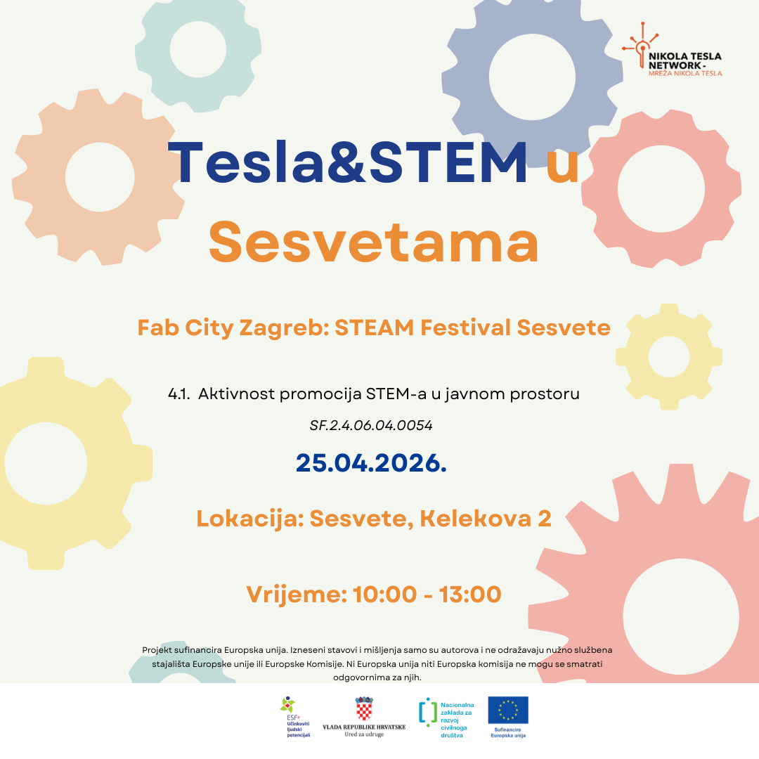 Dana 25. travnja 2026. od 10:00 do 13:00 sati održat ćemo manifestaciju „Tesla & STEM” u sklopu Fab City Zagreb: STEAM Festivala Sesvete, na adresi Kelekova 2.